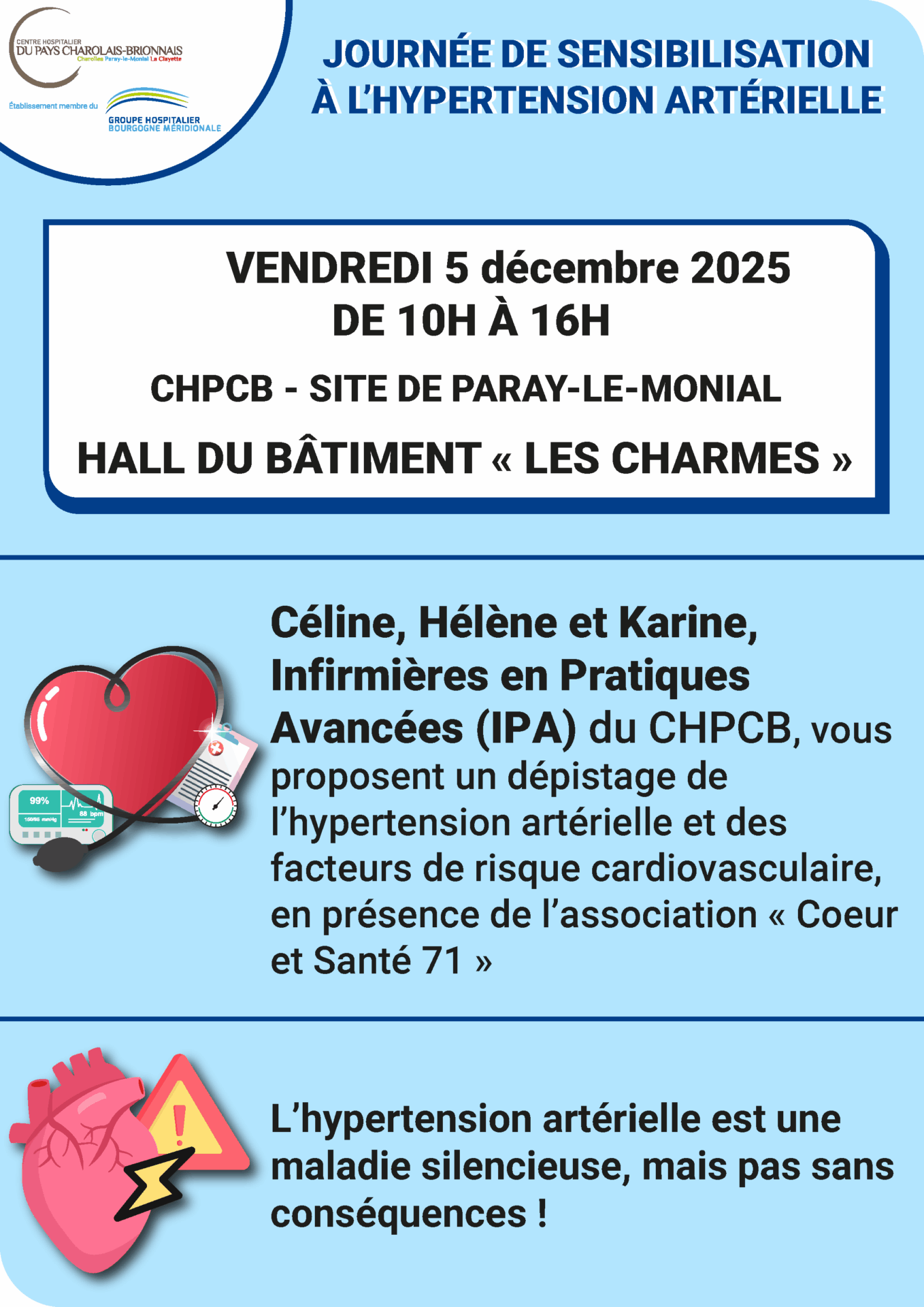 Vendredi 5 décembre 2025 les Infirmiers.ières en Pratiques Avancées (IPA) du CHPCB organisent une journée de sensibilisation sur les risques liés à l’hypertension artérielle (HTA). Une excellente occasion pour en savoir plus sur cette maladie silencieuse et ses conséquences.