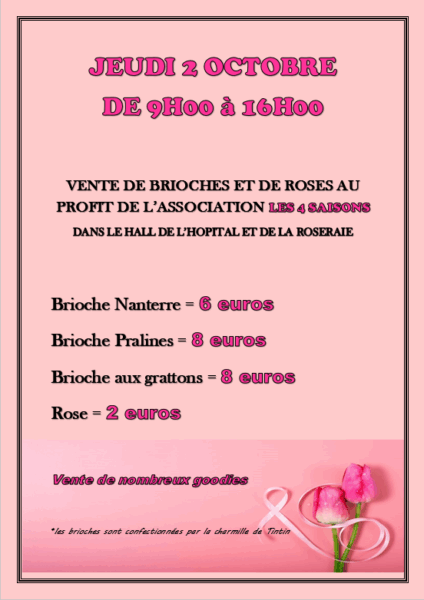 Dans le cadre d’Octobre Rose, une vente de brioches et de roses est organisée le jeudi 2 octobre 2025 dans les halls du site de Paray-le-Monial, au profit de  l’association « Les 4 saisons ».