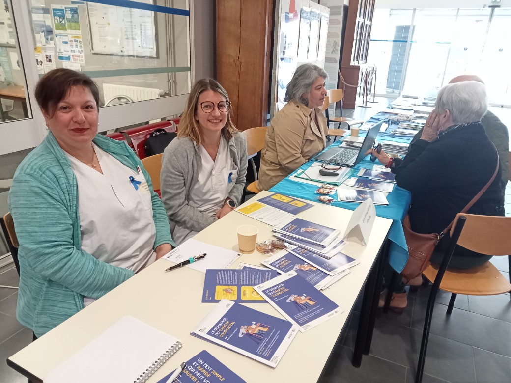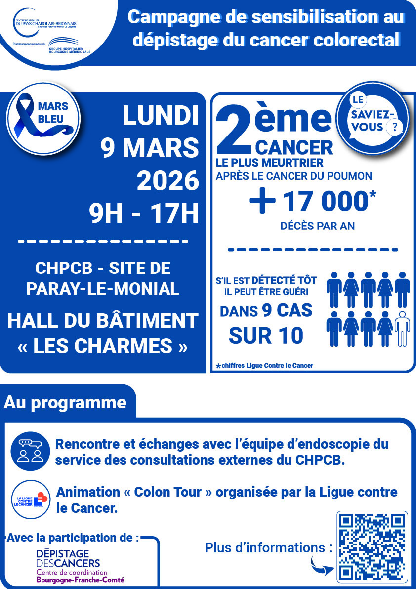 Le lundi 9 mars 2026 a eu lieu, dans le hall du site de Paray-le-Monial, une action de sensibilisation au dépistage du cancer colorectal, dans le cadre de Mars Bleu.